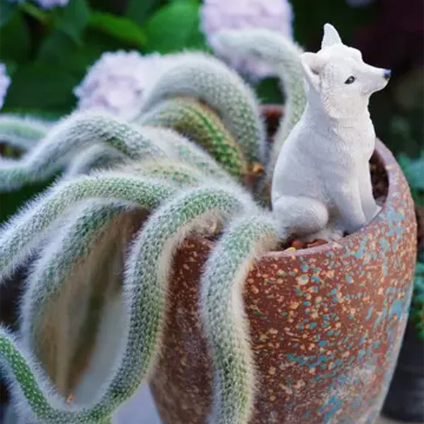 ◆ Monkey Tail Cactus (scientific name: Hildewintera colademononis, formerly known as Cleistocactus colademononis) is a succulent belonging to the genus Hildewintera in the Cactaceae family, native to Bolivia. It features fleshy, columnar stems measuring approximately 2 cm in diameter and growing up to 1.5 meters long. The stems are densely covered with soft white hairs that create a graceful drooping effect. During its seedling stage, the plant grows upright, but gradually develops pendulous stems as it matures. When producing nine or more branches, it's commonly called "Nine-Tailed Fox" due to its resemblance to a fox's tail.