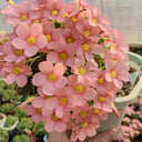 Oxalis convexula showcases an abundance of charming, soft pink flowers with delicate, slightly deeper pink veining that radiate from a vibrant yellow center. Each bloom features five petals, creating a cheerful, open face. The overall effect is a lush and cheerful display of warm pink hues, creating a delightful contrast with the bright yellow eyes.