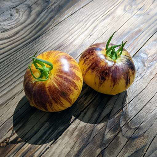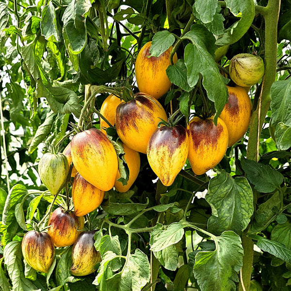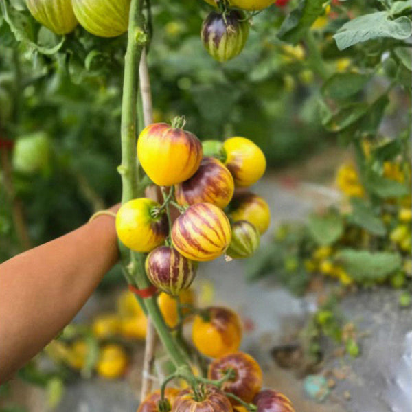 ◆ "Rebel Starfighter Kayleigh Anne" is a medium-early indeterminate tomato hybrid, producing vigorous tall plants with regular foliage. Its crack-resistant, heart-shaped fruits (150-260g) develop golden yellow skin with striking purple-black striping on the shoulders, bearing resemblance to pepino dulce (Solanum muricatum). The anthocyanin-rich fruits deliver exceptional flavor—a balance of intense sweetness and mild acidity, with juicy texture and layered fruity notes. Perfect for fresh markets, they also elevate gourmet presentations.